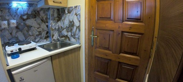 Во склоп на истата соба е и кујната, комплетно опремена со кујнски инвентар, фрижидер, аспиратор и решо.